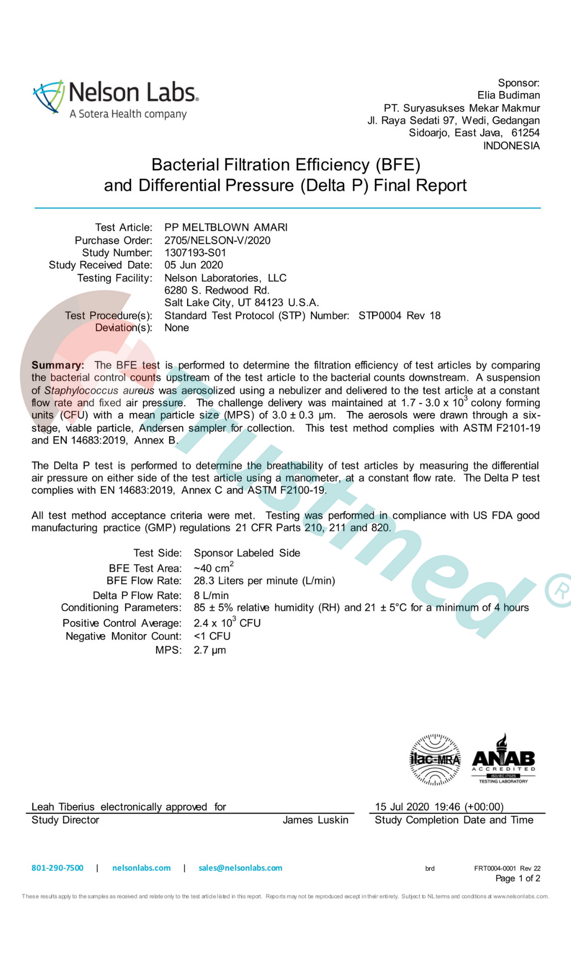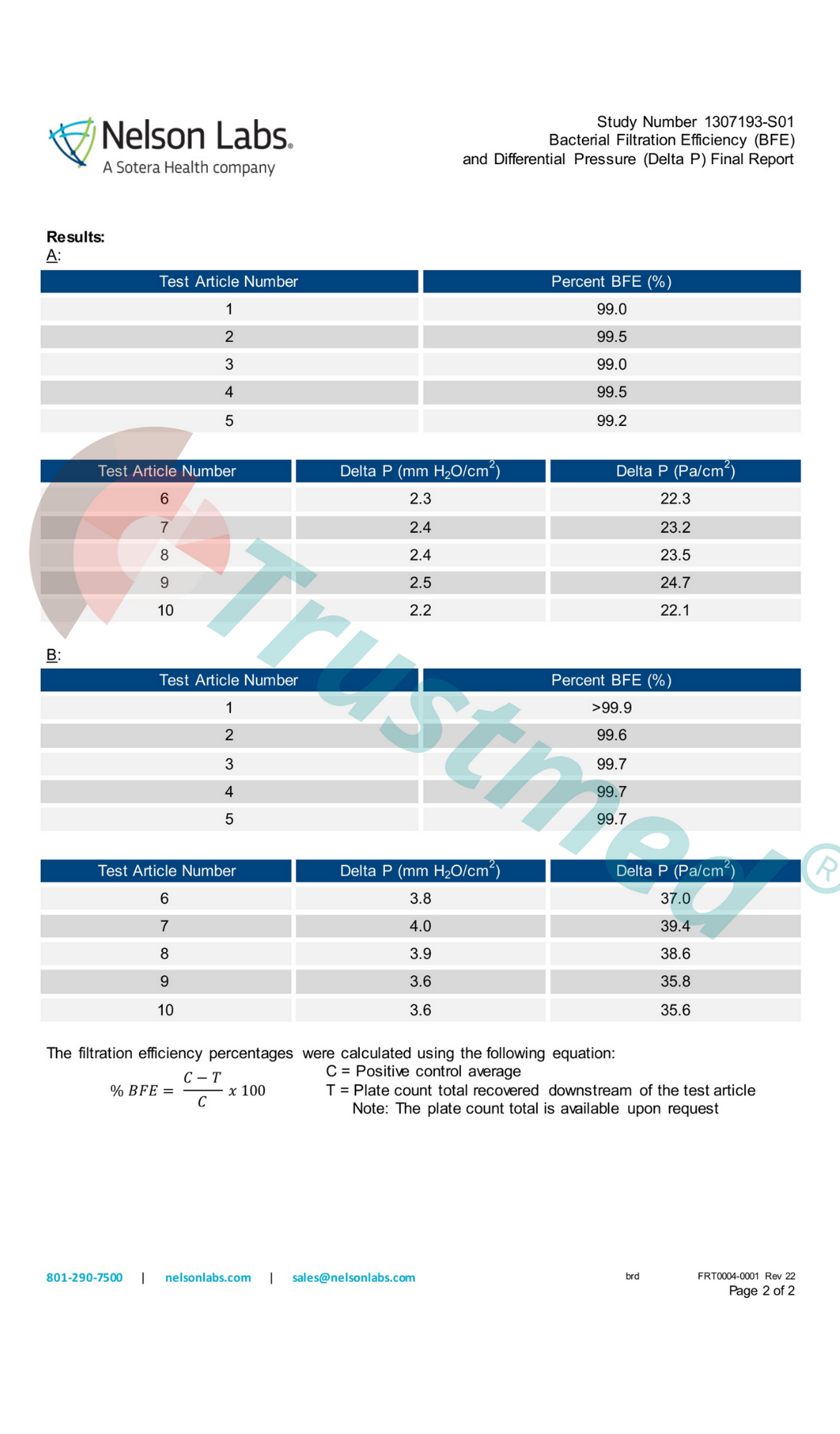 Certified Bacteria Filtration Efficacy BFE 99% from Nelson Labs USA.
